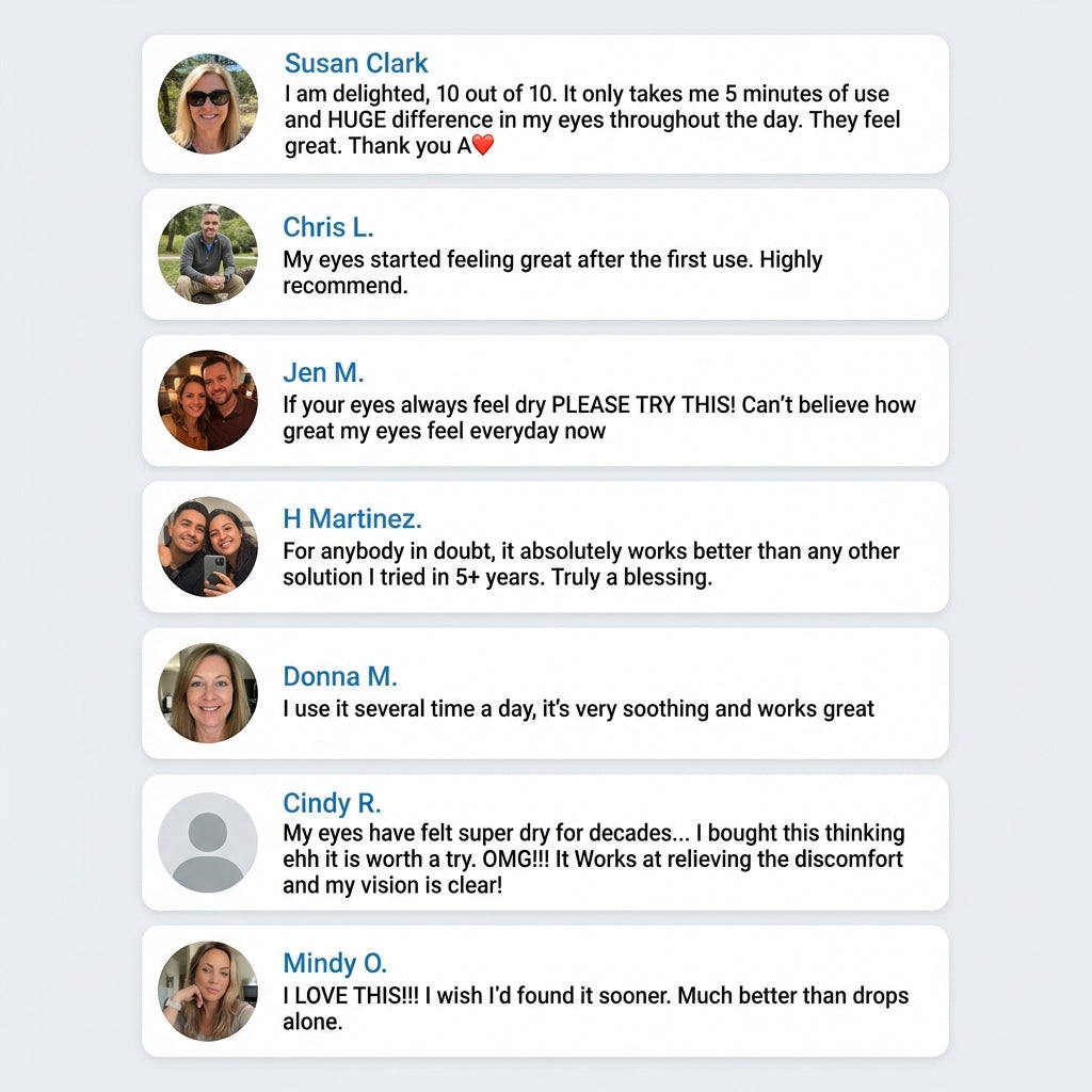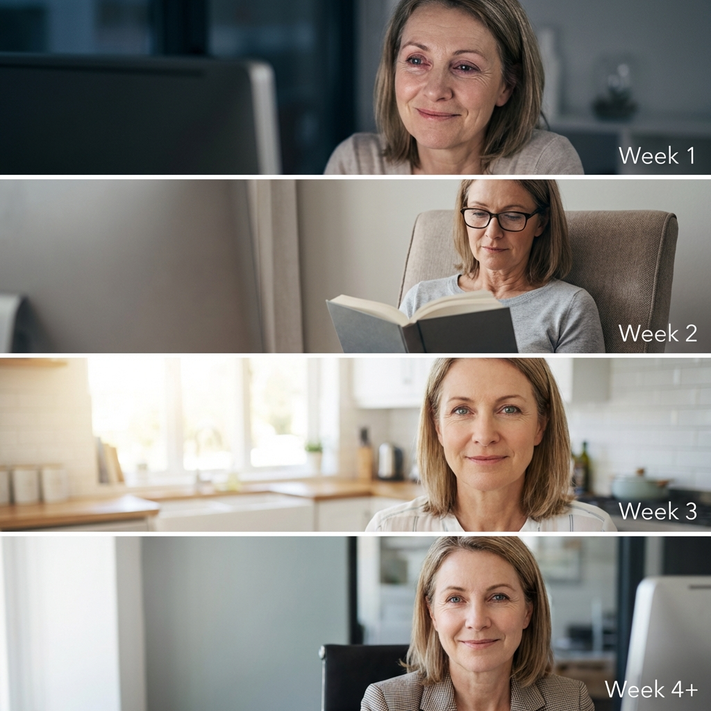 Week 4+: Eyes stay comfortable all day, even in AC. Daily routine, lasting relief.